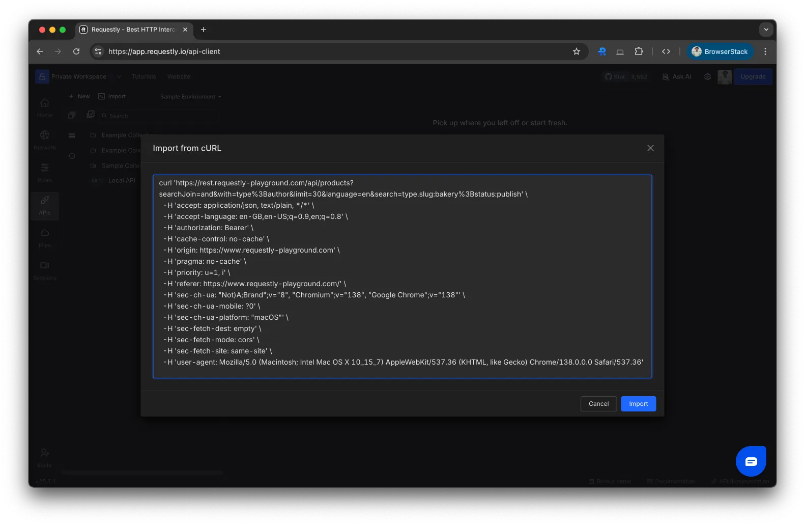 Click the Import button, and Requestly will convert your cURL into an editable API request, ready to use in your workspace.