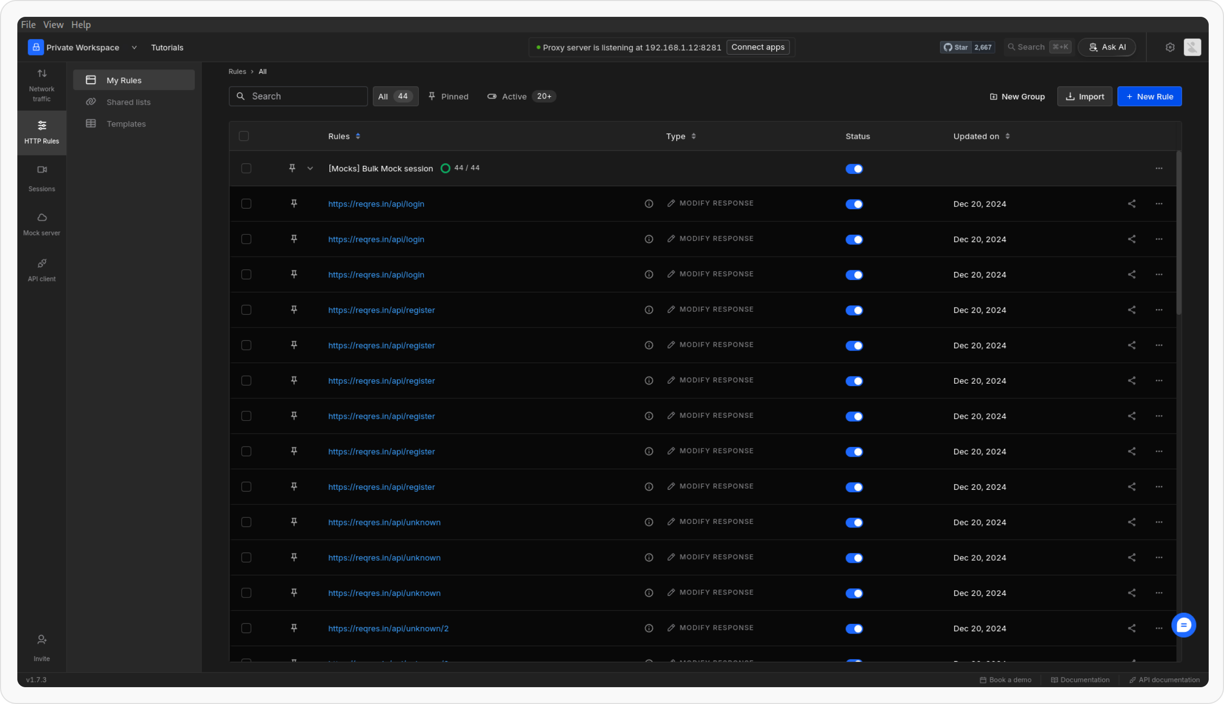 Once you’ve recorded an API session, you can easily generate bulk mock rules based on the captured requests. This is a quick way to mock multiple API endpoints without manually configuring each one.1