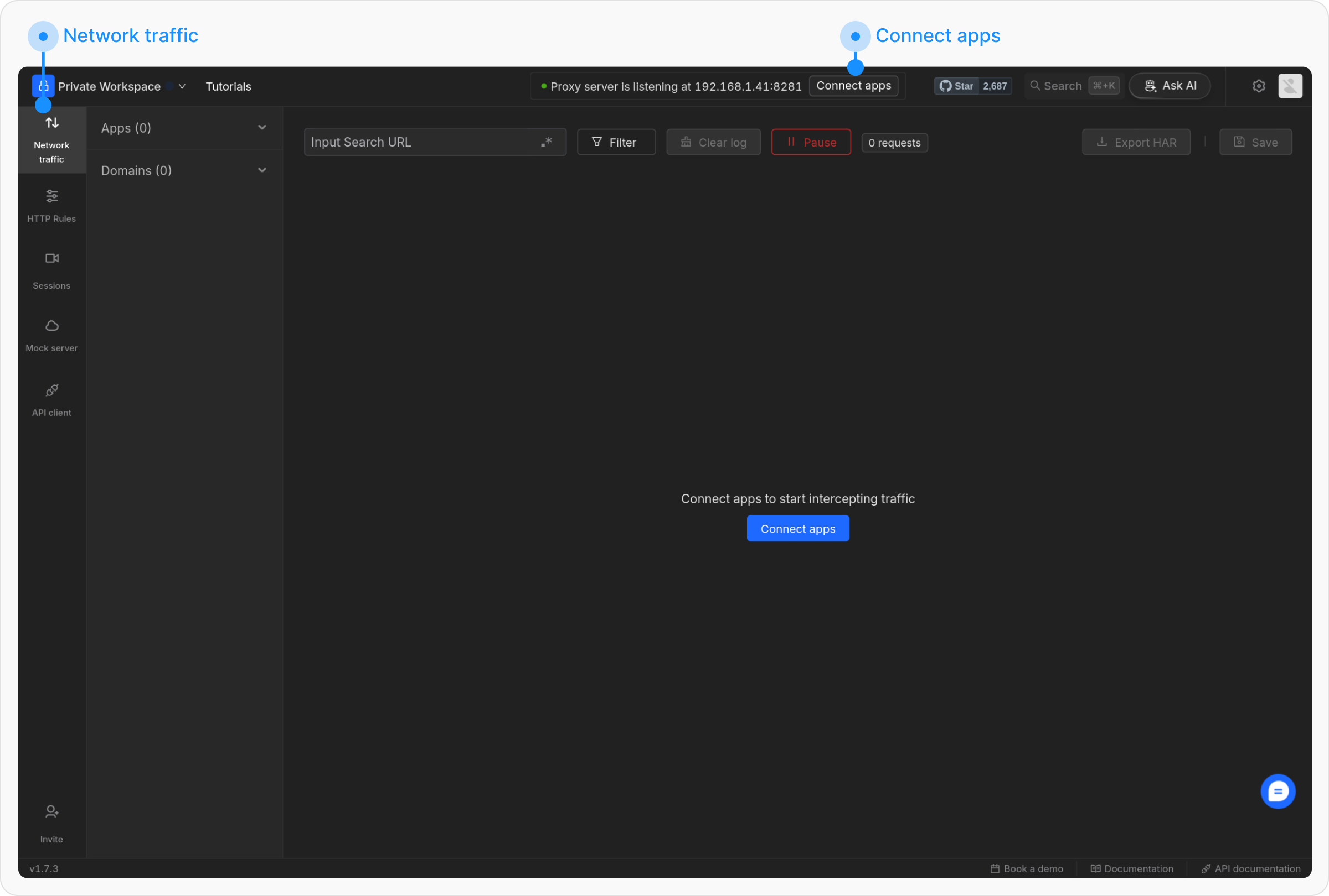 Open the Requestly Desktop App and navigate to the network traffic tab on the left sidebar.