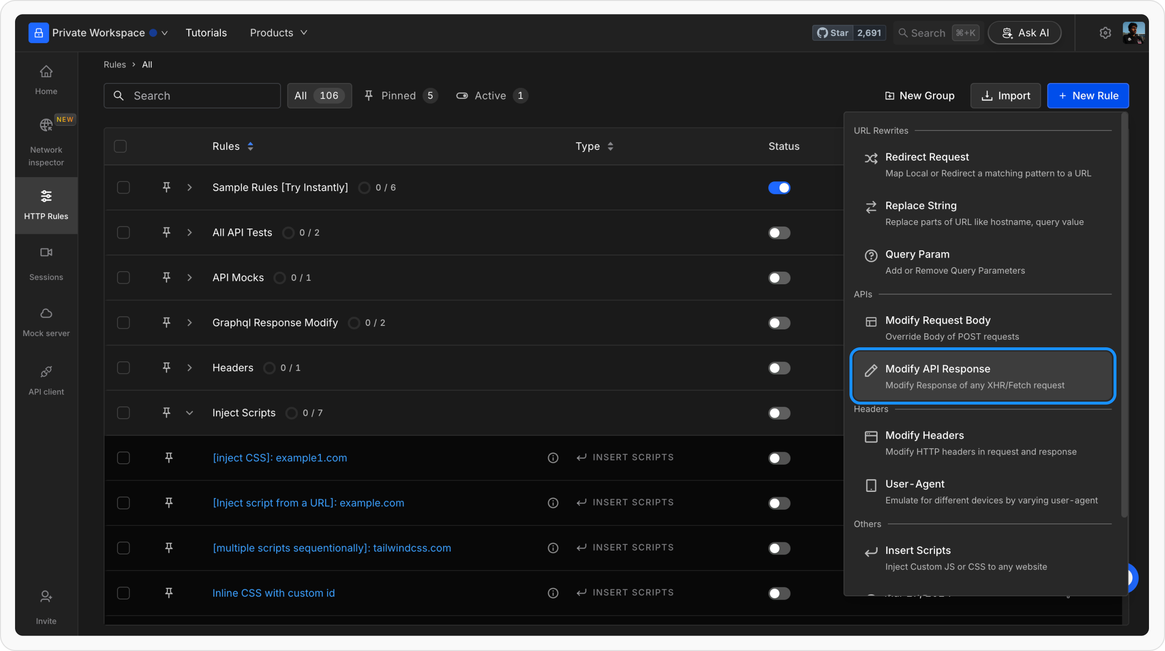 Here click on New rule and select Modify API Response as the rule type.