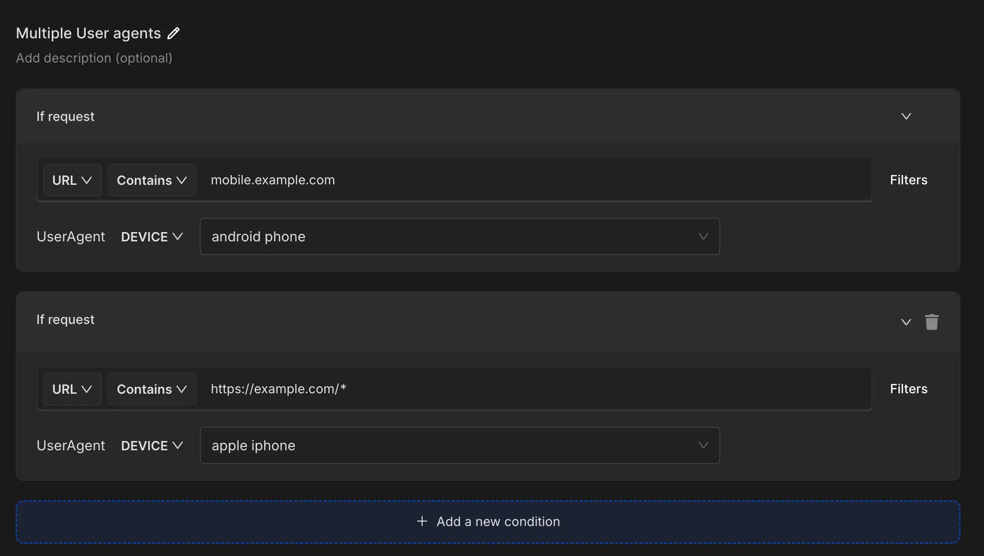 The Modify User Agent Rule in Requestly allows users to define multiple conditions within a single rule to modify the User-Agent header for different URLs. This is particularly useful for testing how a website behaves across different browsers, devices, and platforms without needing to use actual devices or browser extensions.
