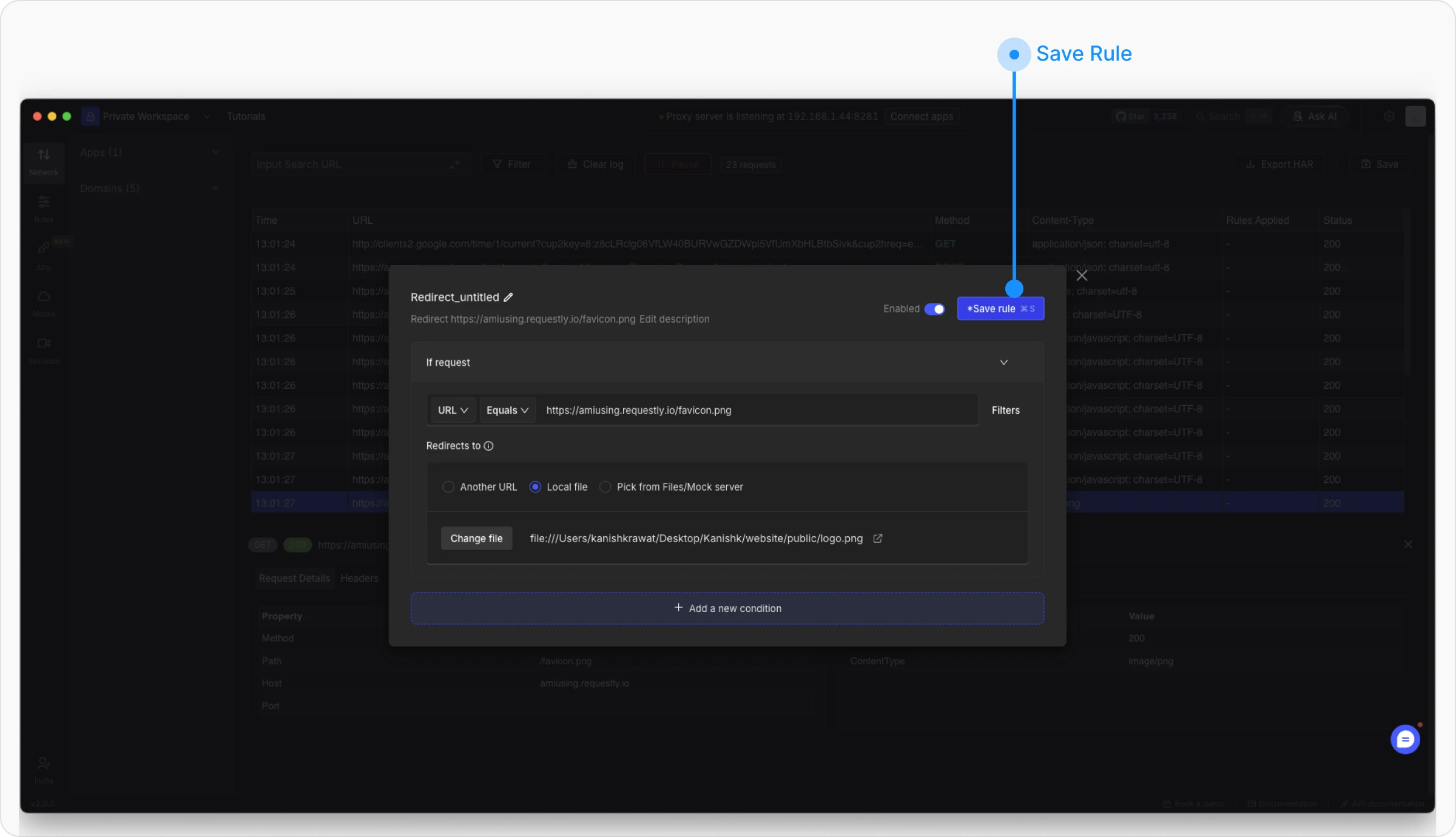 Click Save Rule to save the configuration.Reload the website to see the local file replacing the server response in real time. Ensure the rule is enabled so it remains active and correctly applied.