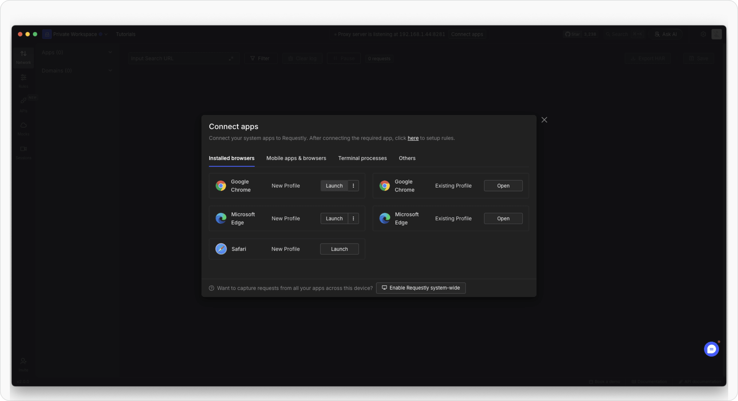 Open the Requestly Desktop app and click Connect Apps to establish the connection. Then, select your browser and open it. Once the browser is open, go to the website where you want to use the Map Local feature.