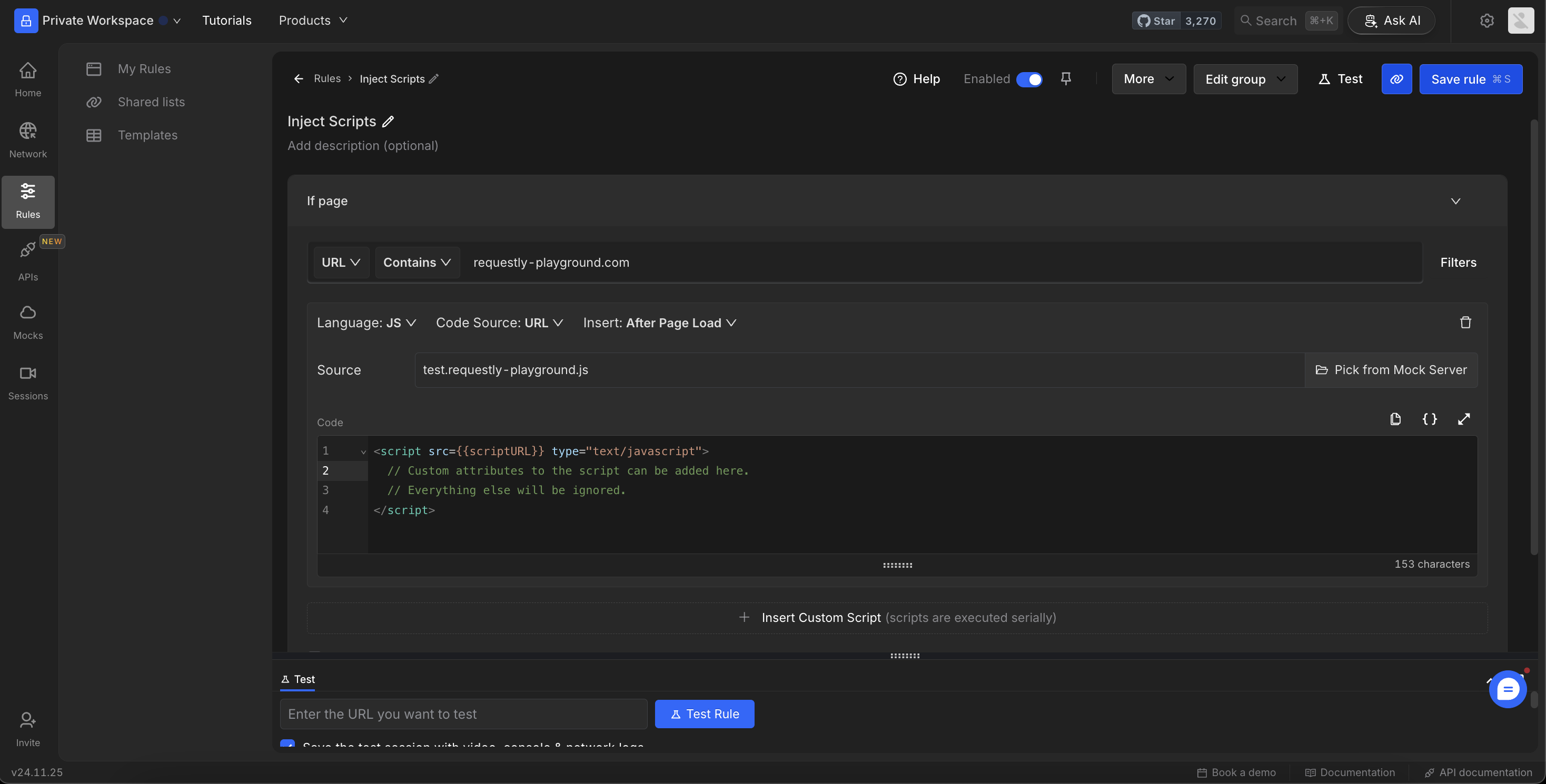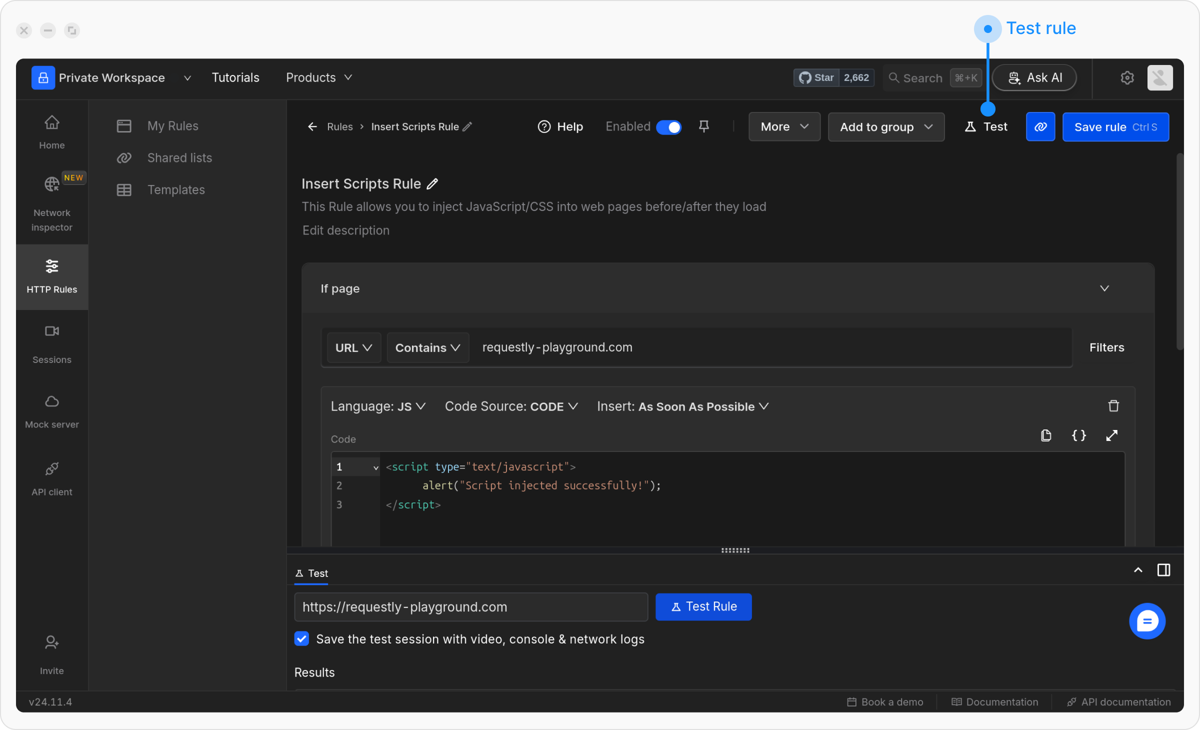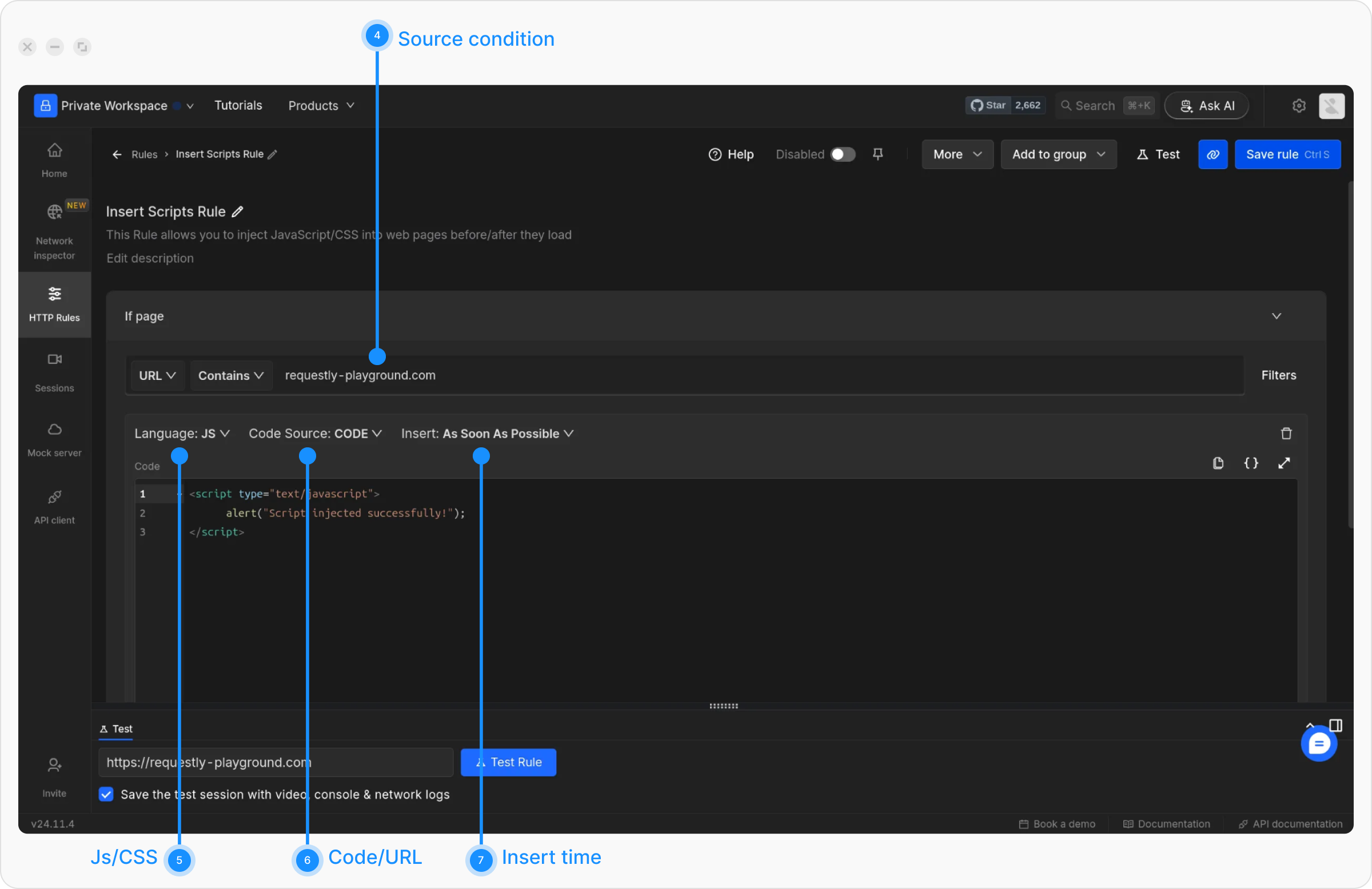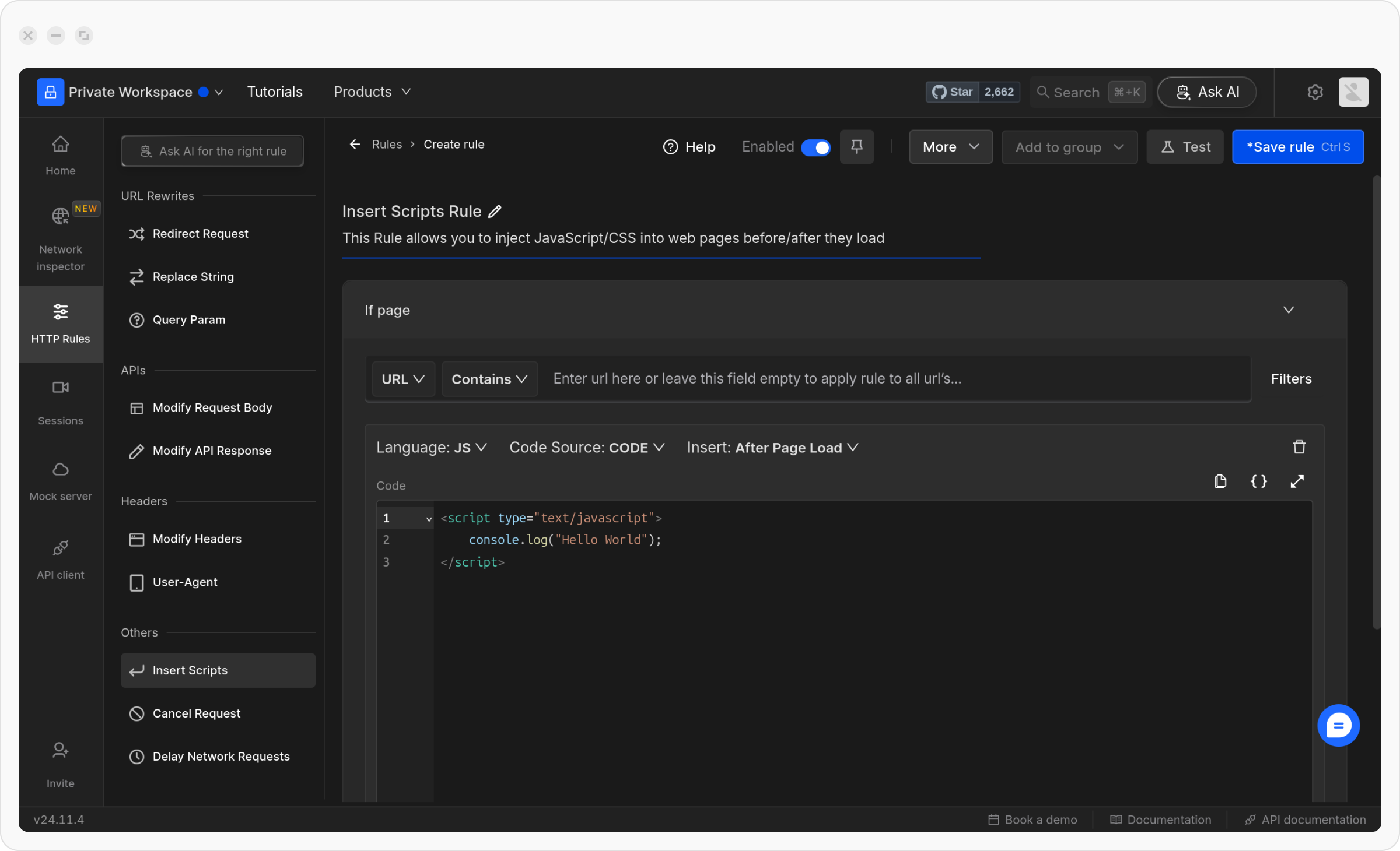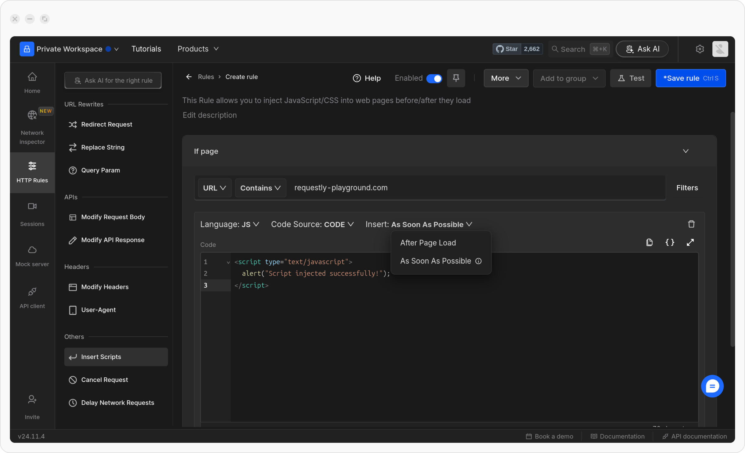 The Insert Scripts Rule allows you to inject JavaScript/CSS into web pages before/after they load. This means you can modify the DOM, change styles, or even add new functionality without altering the source code directly. It’s important for testing hypotheses or debugging during development and quality assurance processes. To see how the Insert Script Rule can be configured and applied in different scenarios, watch the video below, where we demonstrate its usage and potential