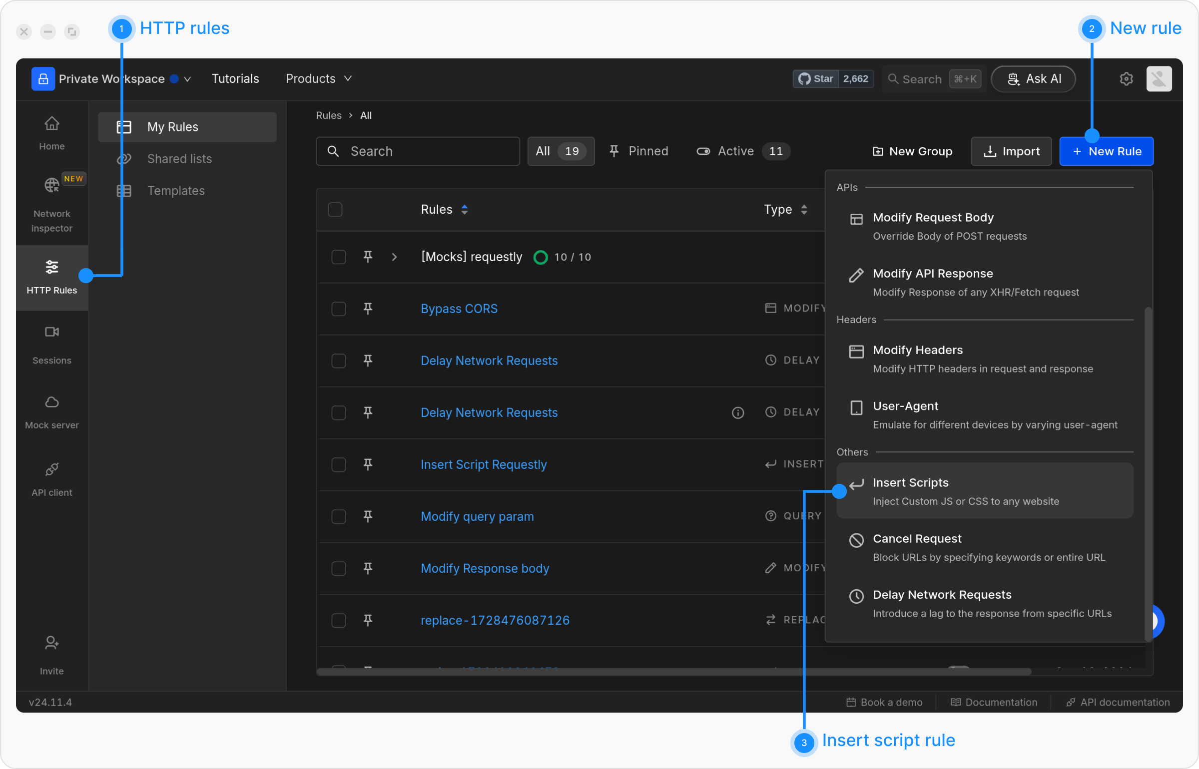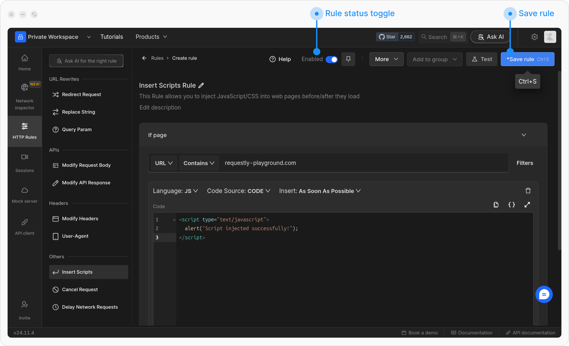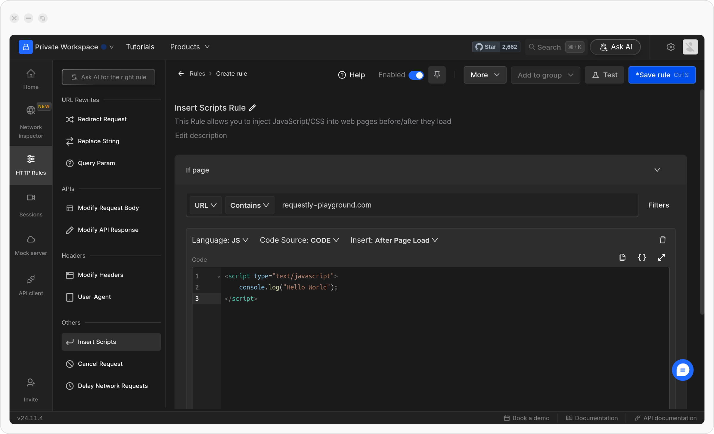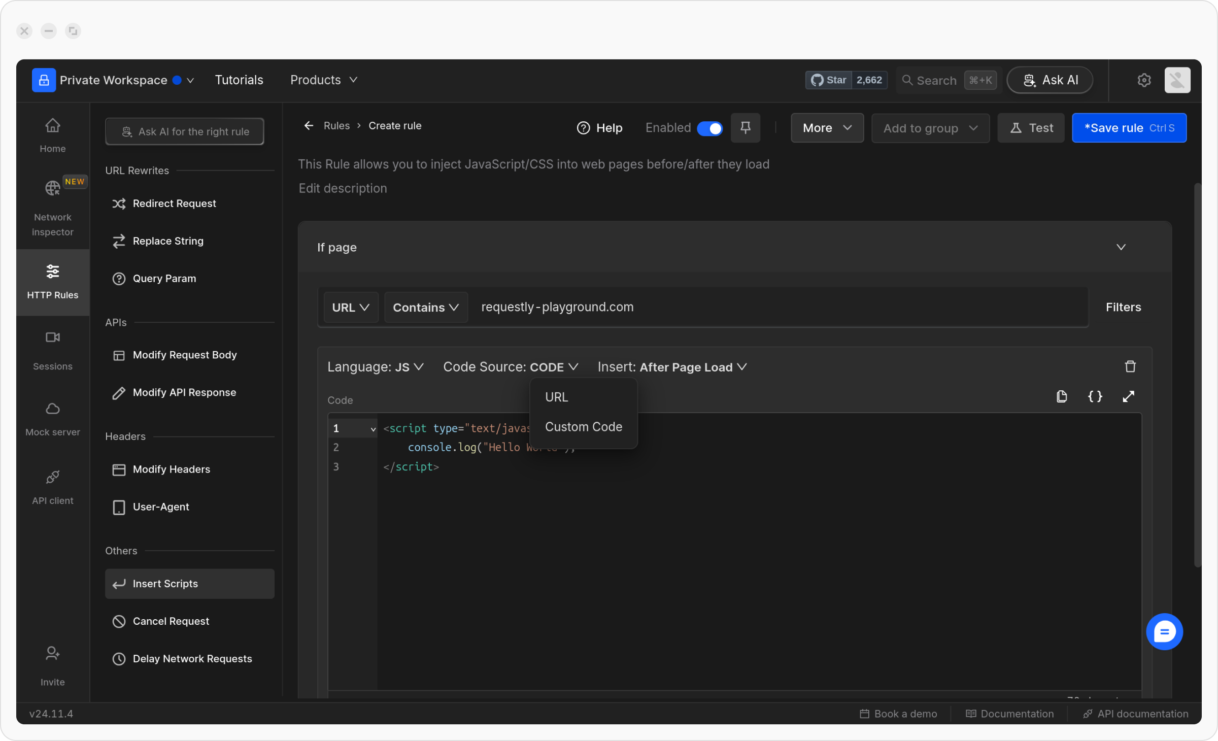 Navigate to the HTTP Rules tab in the web or desktop app. Click on + New Rule and select Insert Script from the options.