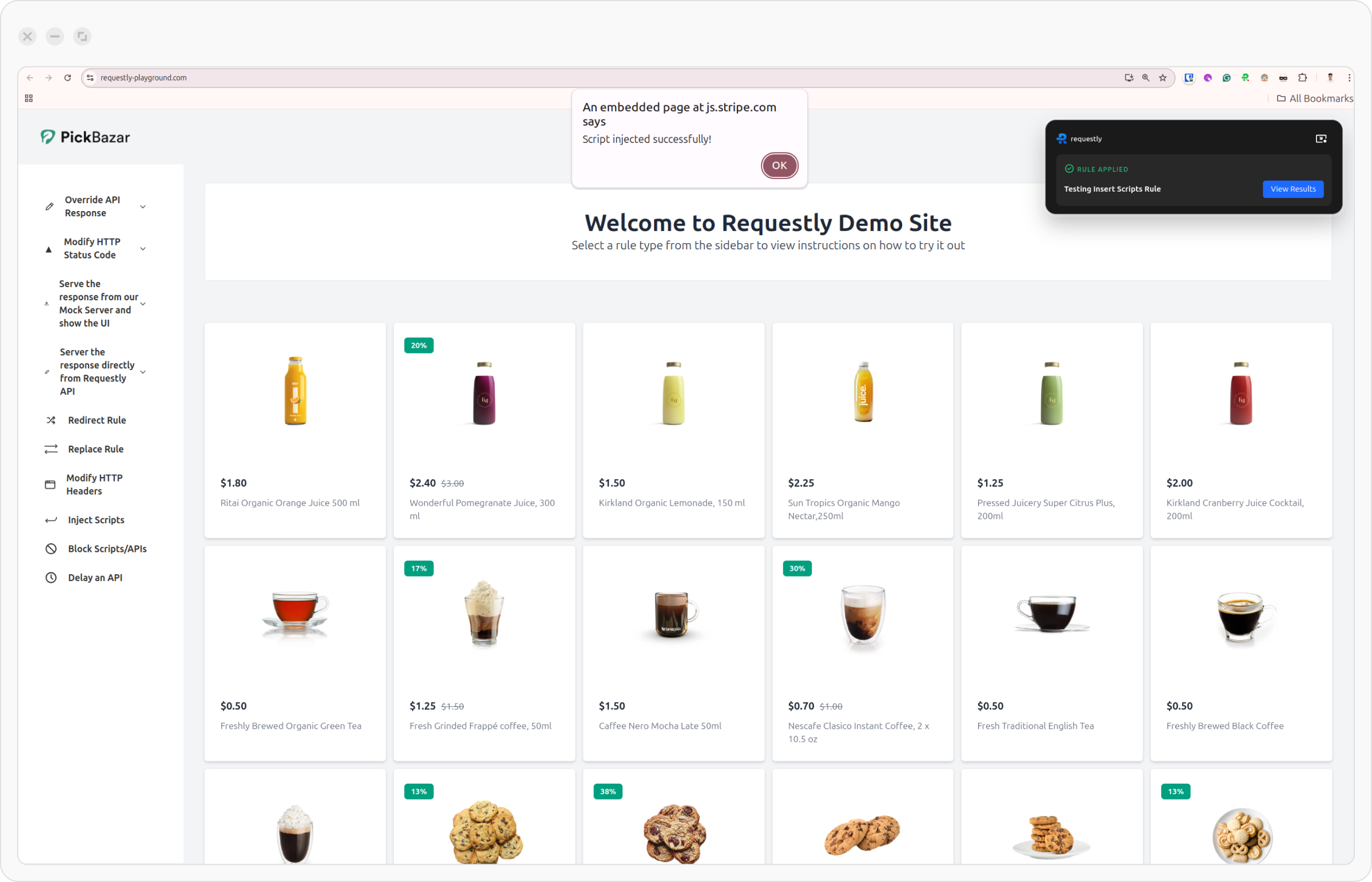 To ensure the rule is working correctly, click the Test button and enter the URL of the page where you want to apply this rule.A confirmation widget will appear to indicate if the rule has been successfully applied.Here, you can see that the rule has been applied, and an alert displays the message Script Injected Successfully.ORHere, you can see that the rule has been applied, and the styles defined in the CSS are applied to the page.