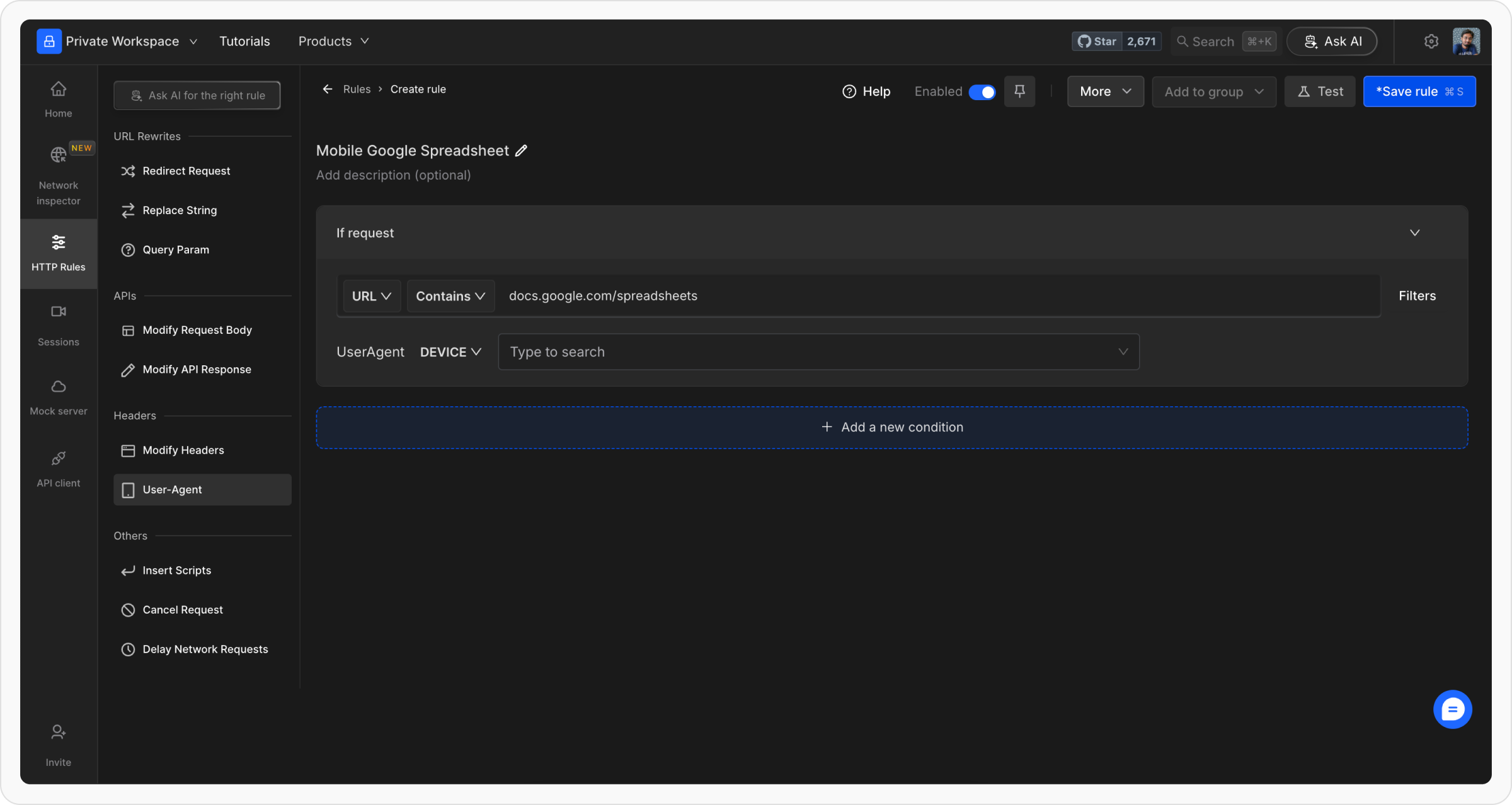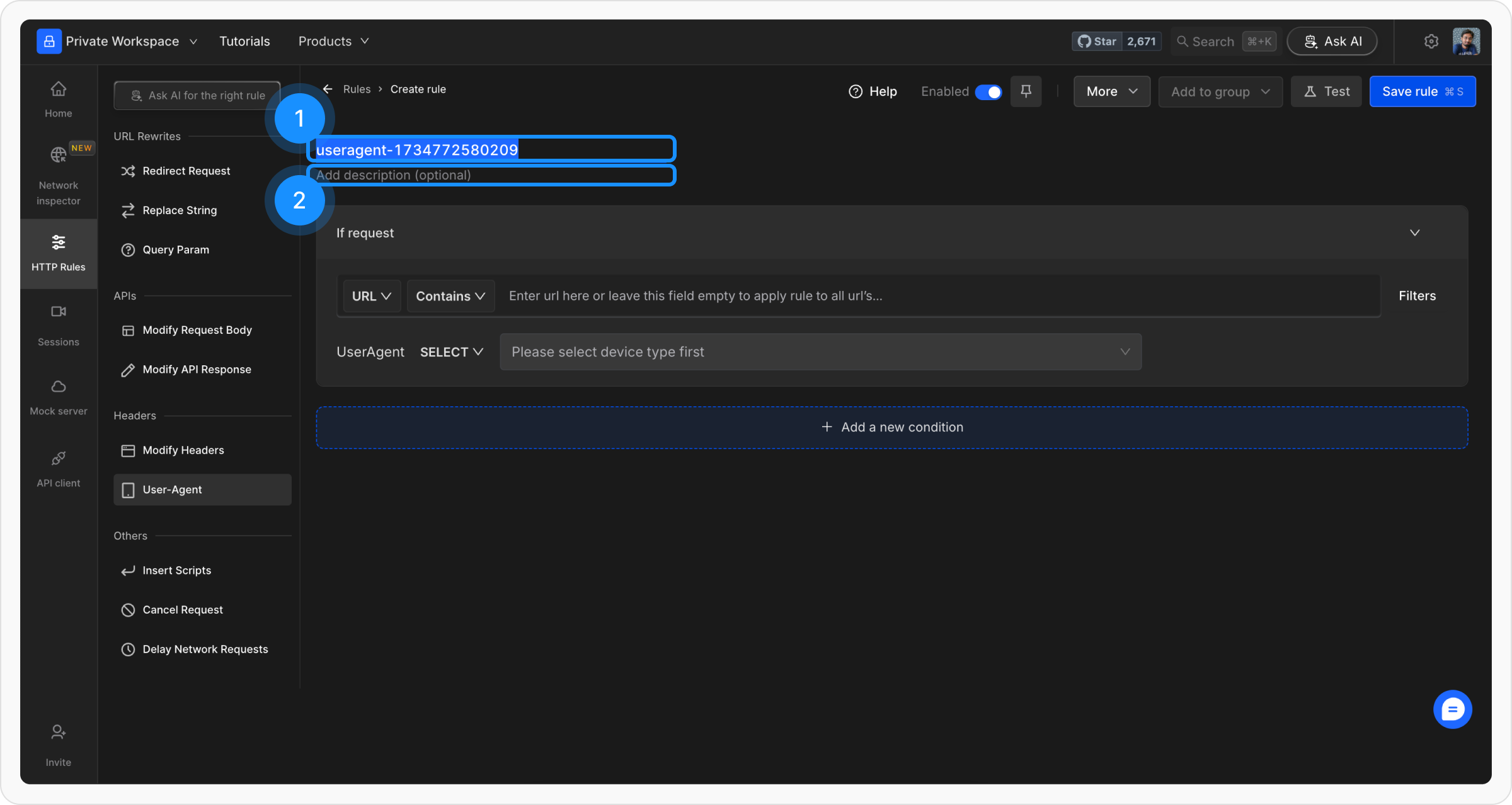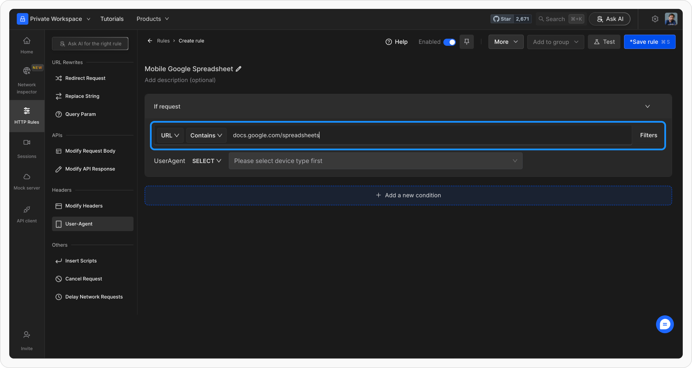 + New Rule button and select User-Agent from the available options.