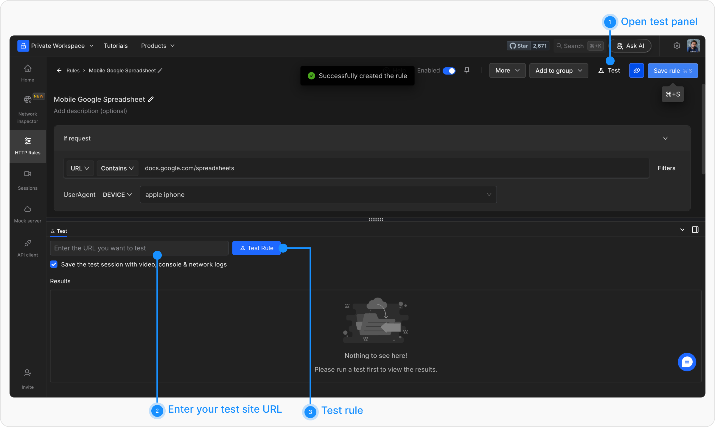 Navigate to the HTTP Rules section in the Requestly app. Click on the