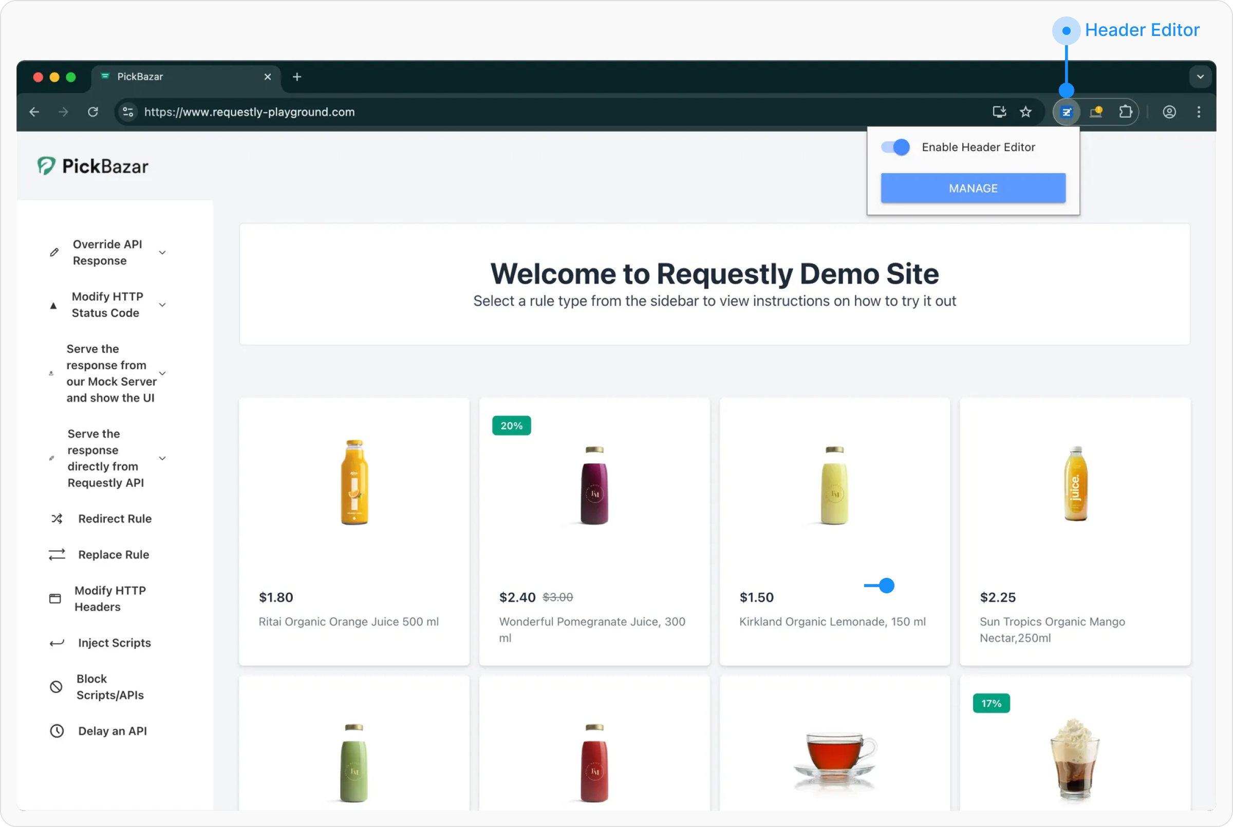 Click on the Header Editor icon in your browser’s extensions toolbar and click on manage.